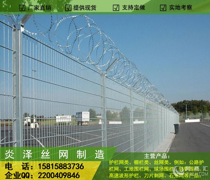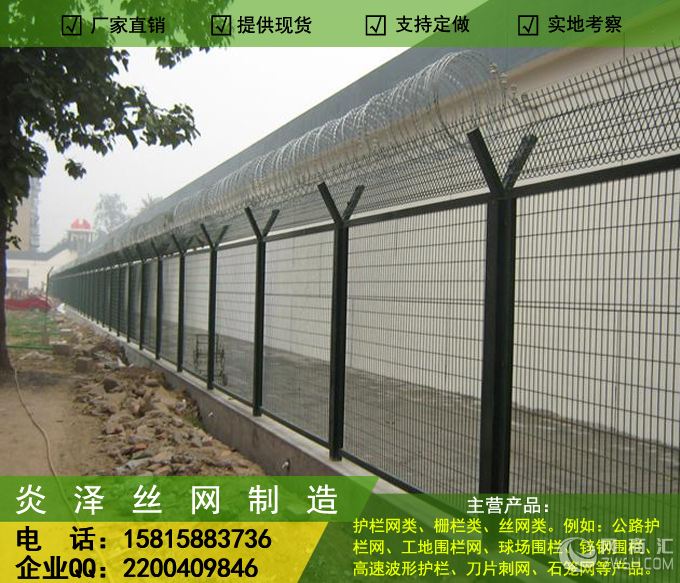 高安全防护网或358护栏,358防爬网,是目前护栏防护中非常受欢迎的一种护栏类型,因其孔小,能大程度上防止人或工具攀爬,更安全的保护您周围的环境 。本公司358监狱防攀爬网主要种类有:镀锌、PVC涂塑、高尔凡丝监狱防攀爬网。 网孔尺寸:12.7x76.2mm 或者可以根据客户的实际需要进行调整为12.5x75mm或13x76mm 配件:一般配有方柱60x60mmx3mm跟护栏网片同样的表面处理方式,通过螺丝将扁铁和柱子,连接起来,也就是说防护网的安装几乎不受任何地形的任何影响,可以预埋或者是通过法兰盘与水泥地面固定,,护栏顶部可以通过Y型柱配有刀片刺绳,普通刺绳,进一步起到防护作用。