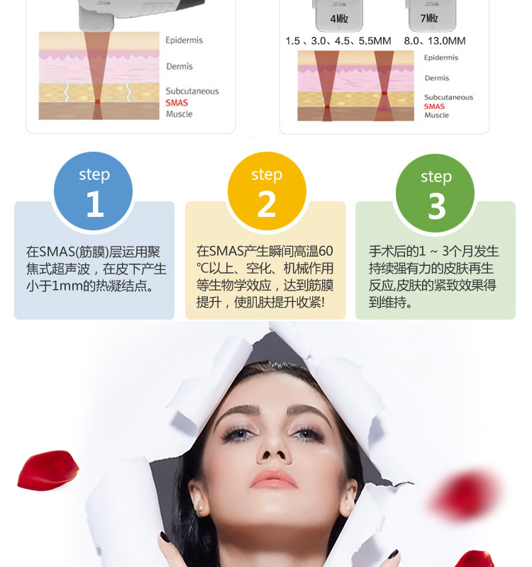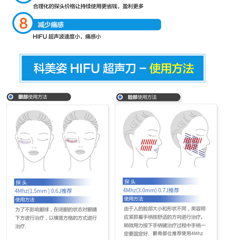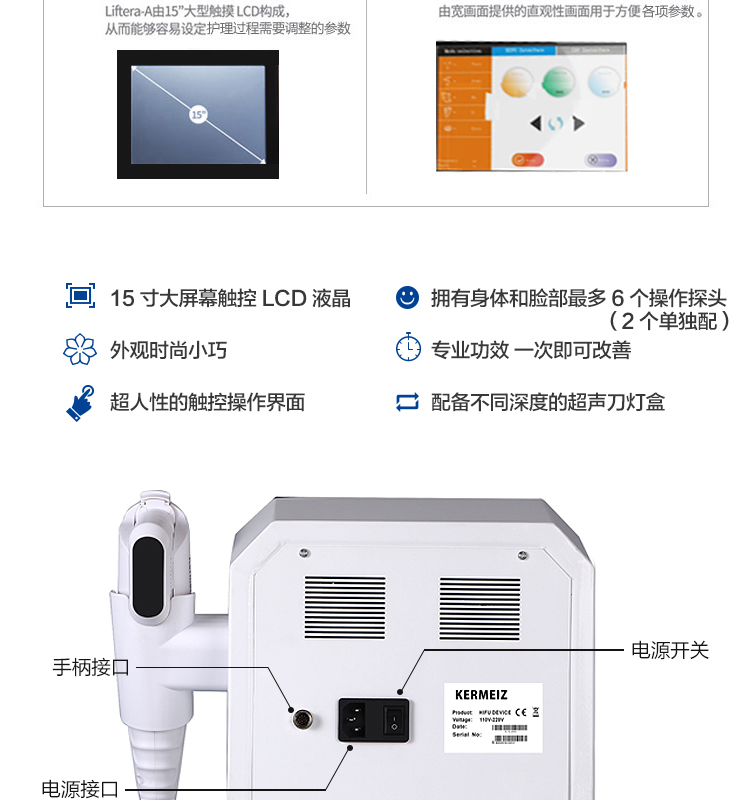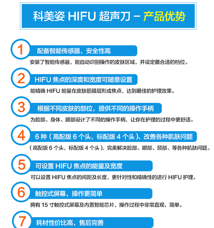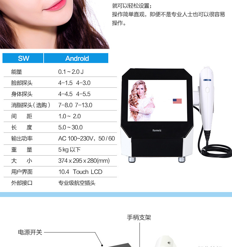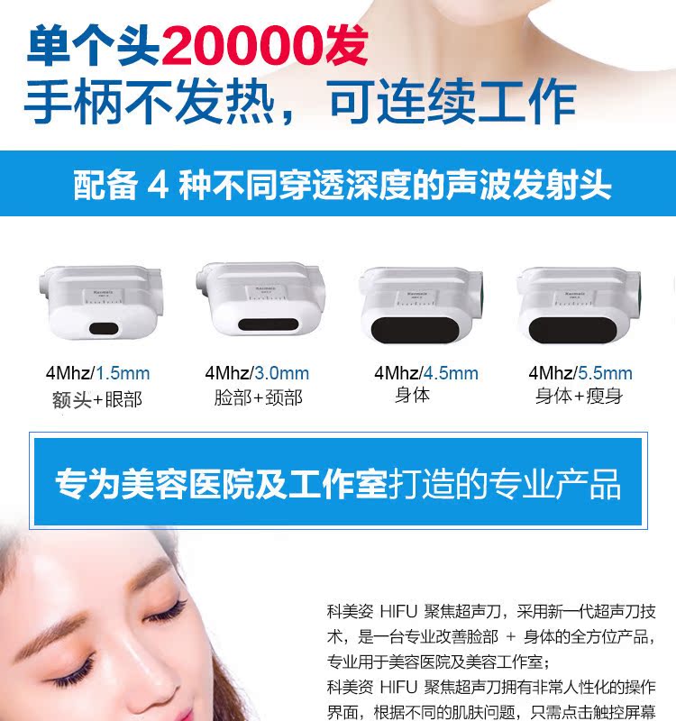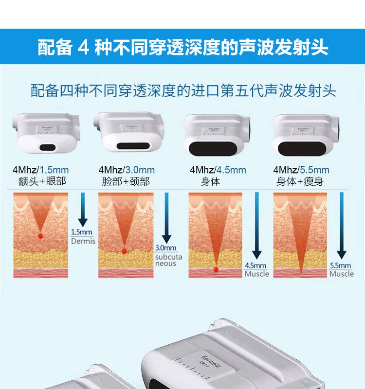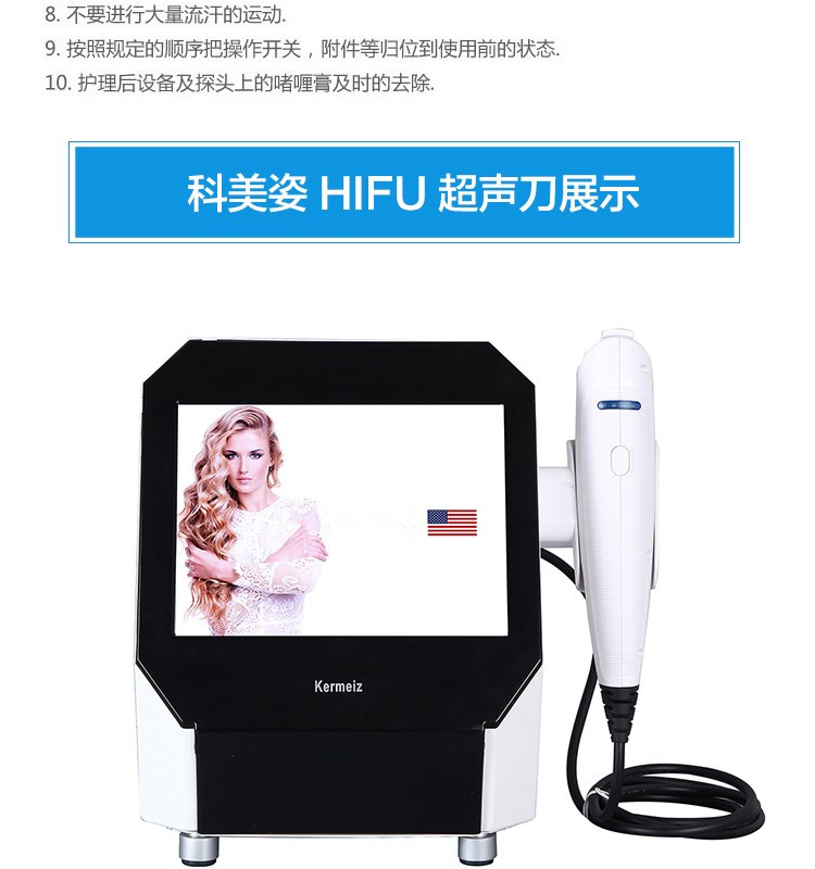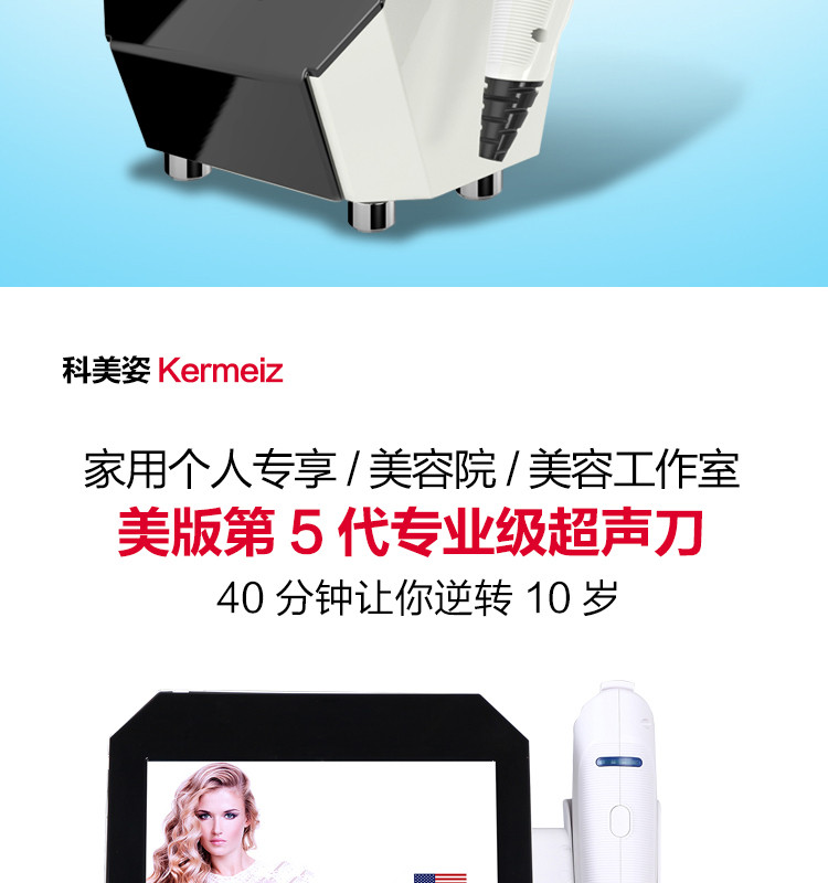 1:完美兼容家庭使用和美容院两大群体。宜家宜商,真正的美版超声刀,每个原装进口机芯,探头,电源总成及操作系统,保证仪器效果出色的同时,仪器运行更加稳定,可连续工作10个小时以上! 2:标配配四探头。1.5/3.0/4.5/5.5,可增配《8.0,13探头》其中5.5是专门减肥瘦身紧致提拉嫩肤美白的效果(市场上老款超声刀仅配三个探头) 3:每个探头具有20000发能量。(市场上老款3代是五千发能量,老款4代也仅是一万发能量) 4:一发对焦亚克力板可达50个能量点,点距精细达到0.6MM。(老款的超声刀仅可以对焦21个能量点,对焦也只能达到1.0MM)打点越多代表效果越好,点距越小代表的效果越均匀有效 5:第五代超声刀调节模式:分为全新电脑智能自动化调节能量,和手动调节两种模式。选择智能化调节无需传统手动调节能量参数,电脑系统智能感应根据操作者皮肤智能调节参数。非专业人士也能熟练掌握操作,能量调节更加精准有效!(老款超声刀全部手动调节模式,操作难度系数较大!} 6:,15高清寸LCD显示屏,操作更直观(老款超声刀仅8或者10寸的电阻屏。分辨率底,感应度差!) 7:后期探头耗材损耗更低,配件价格按照大客户价格,耗损配件维护费用极低! 8:三年免费质保,终身免费维护!完美的售后团队,专业的美导团队老师,终身陪同服务一对一悉心指导操作 标配四探头,(可单独增配2个)每个探头具有两万发能量。一发对焦亚克力板50能量点,点距精细达到0.6MM。效果更均匀有效。全新电脑智能化调节能量,无需传统手动调节。更加精准!15寸LCD显示屏,操作更直观,美国原装进口探头,芯片,电源总成及操作系统,三年质保,终身免费维护,专业美导老师上门一对一指导。美版五代超声刀家用祛皱提拉紧致嫩肤美容仪器,批发价:5200元/套, 至少十套起批;产品信息详情请登入公司主页:http://pfkjmi8114.cn.kebi.biz/公司发货地址:上海市嘉定区澄浏中路36-38号;联系人:13817404285 QQ:3367782878赵文才先生、王晓娜女士