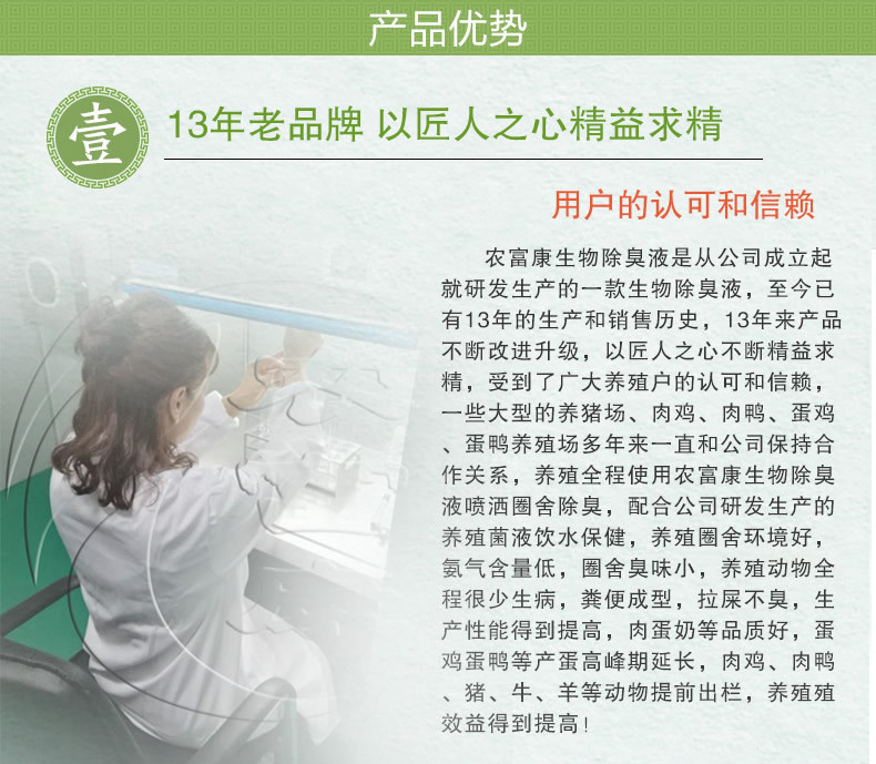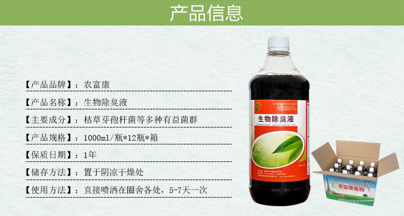 生物除臭液的优点是微生态产品,安全无害,不会产生二次污染,可带鹌鹑直接喷洒使用,只要有适宜的温度和湿度,生物除臭液中的益生菌就可以繁殖代谢产生作用,用一次可持续7天以上圈舍不臭,次喷洒1小时后就感到臭味明显降低。农富康生物除臭液是从公司成立起就研发生产的一款生物除臭液,至今已有13年的生产和销售历史,农富康生物除臭液富含枯草芽孢杆菌、酵母菌、乳酸菌、放线菌等多种有益菌群,13年来产品不断改进升级,以匠人之心不断精益求精,受到了广大养殖户的认可和信赖,养殖全程使用农富康生物除臭液喷洒养鹌鹑场圈舍除臭,配合公司研发生产的养殖菌液饮水保健,鹌鹑圈舍环境好,氨气含量低,圈舍臭味小,鹌鹑全程很少生病,粪便成型,拉屎不臭,提前出栏,养殖效益得到提高!