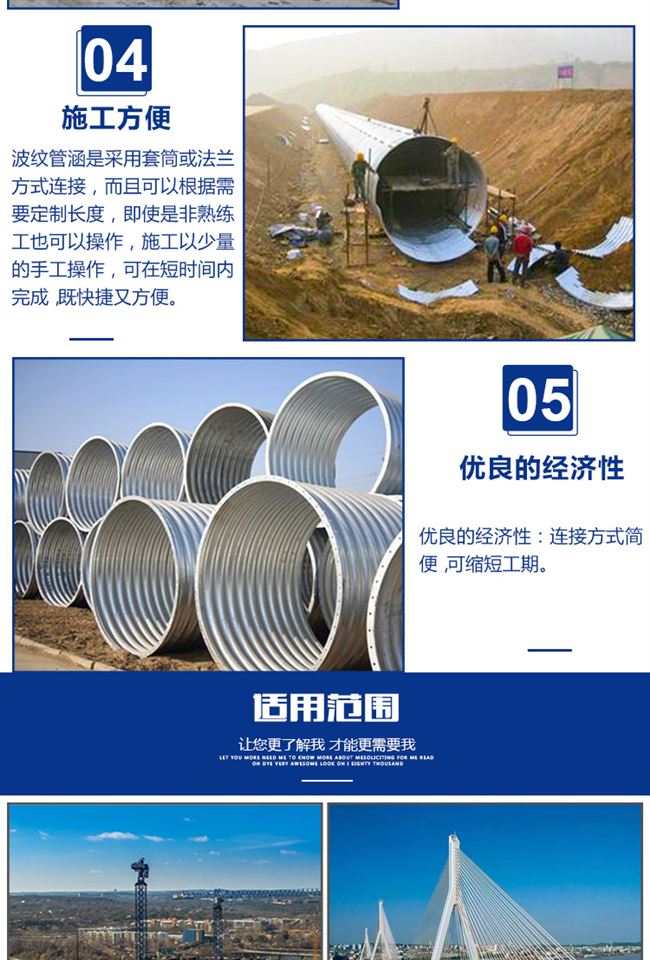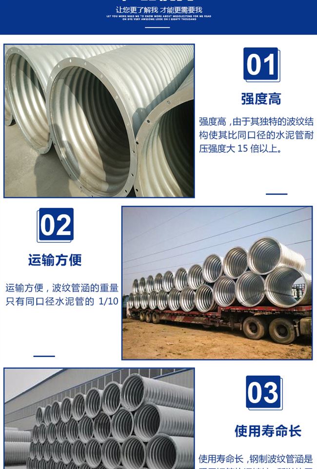 直径为0.4米-6米的拼装钢波纹管可以根据填土厚度选择钢板厚度,厚度从2.75mm-10mm都可以定制。