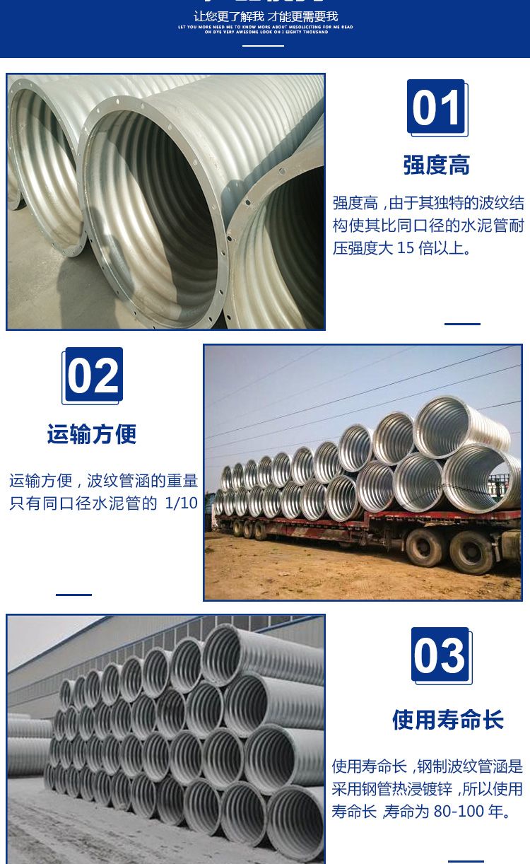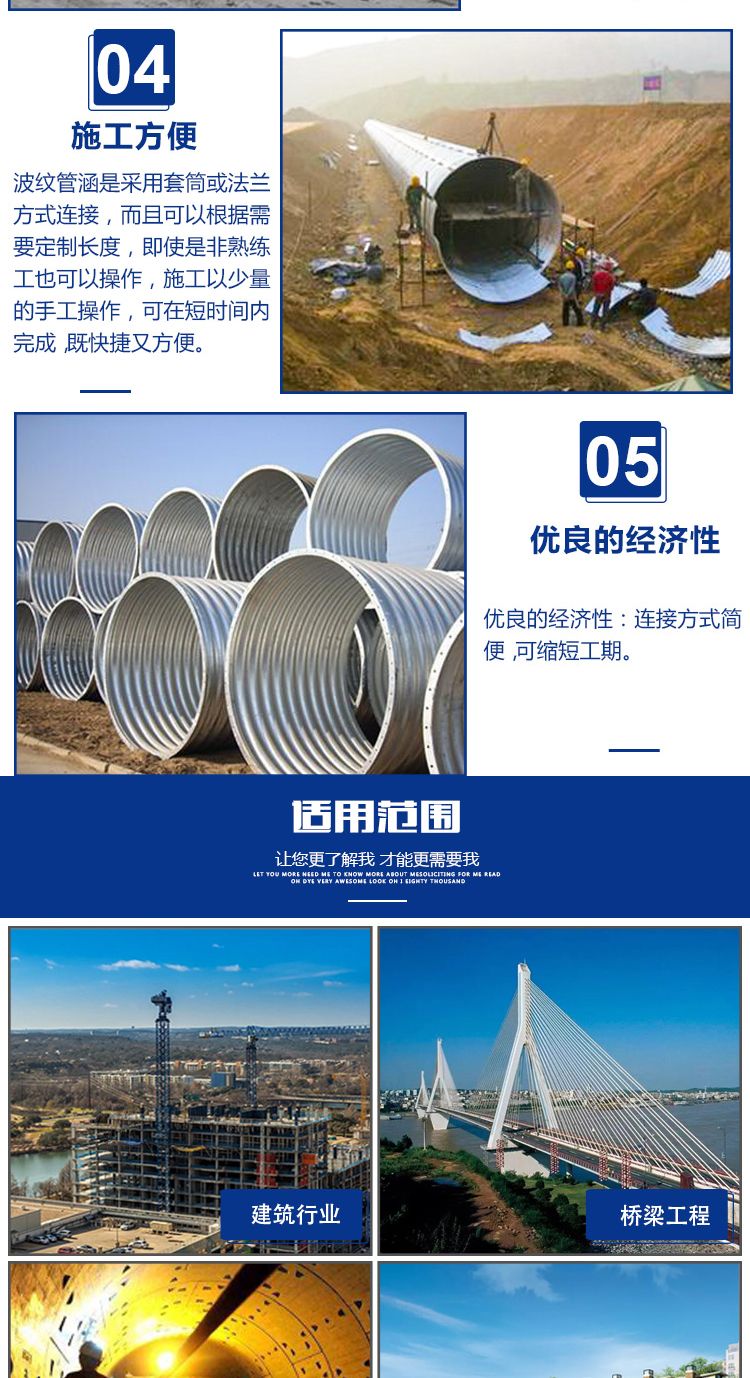 波纹管涵的加工: 将1.6-10.0mm薄钢板压成波纹后,制成管节或弧形板片,采用高强螺栓连接,修建成的建筑物。利用波纹增加钢板的抗弯惯性矩,具有较高的承载能力和稳定性。 通过土与结构的相互作用来承担荷载。 波纹钢管涵洞适用范围: 1.高填方路段:采用拱涵或盖板涵地基承载力不满足要求时,或施工质量难以保证且费用较高时。 2.山区公路:浇筑混泥土使用的原料缺乏,施工用水困难,或水泥,钢材等材料运输不便时。 3.不良地质条件:常年冻土、膨胀土、软土、湿陷性黄土等特殊地区,地基不均匀沉降可能对刚性涵洞造成破坏时。 4.北方地区:受工期影响或季节气候制约,采用混凝结构难以满足质量及工期要求时。 5.快修工程:应急抢险,救灾等对工期要求较紧的涵洞。 6.一般公路工程:与同等跨度的常规混凝土管涵,盖板涵和箱涵相比,波纹钢管涵洞在受力性能,施工工期,使用寿命,行车舒适度,养护成本,综合造价等综合因素具有可比性时。