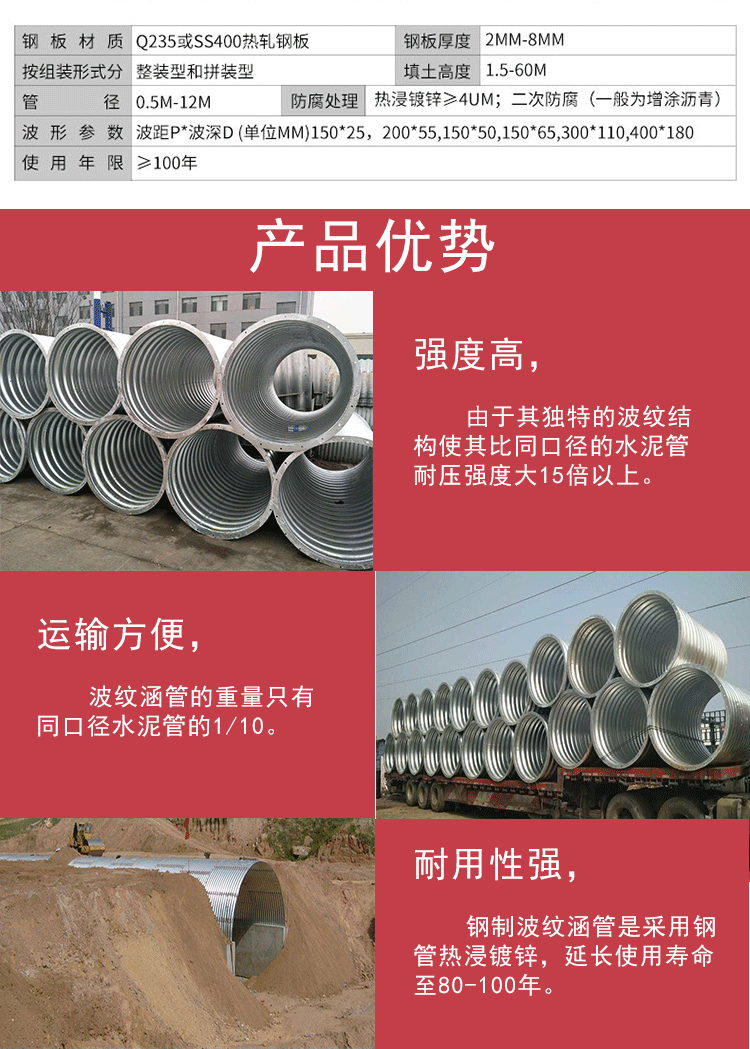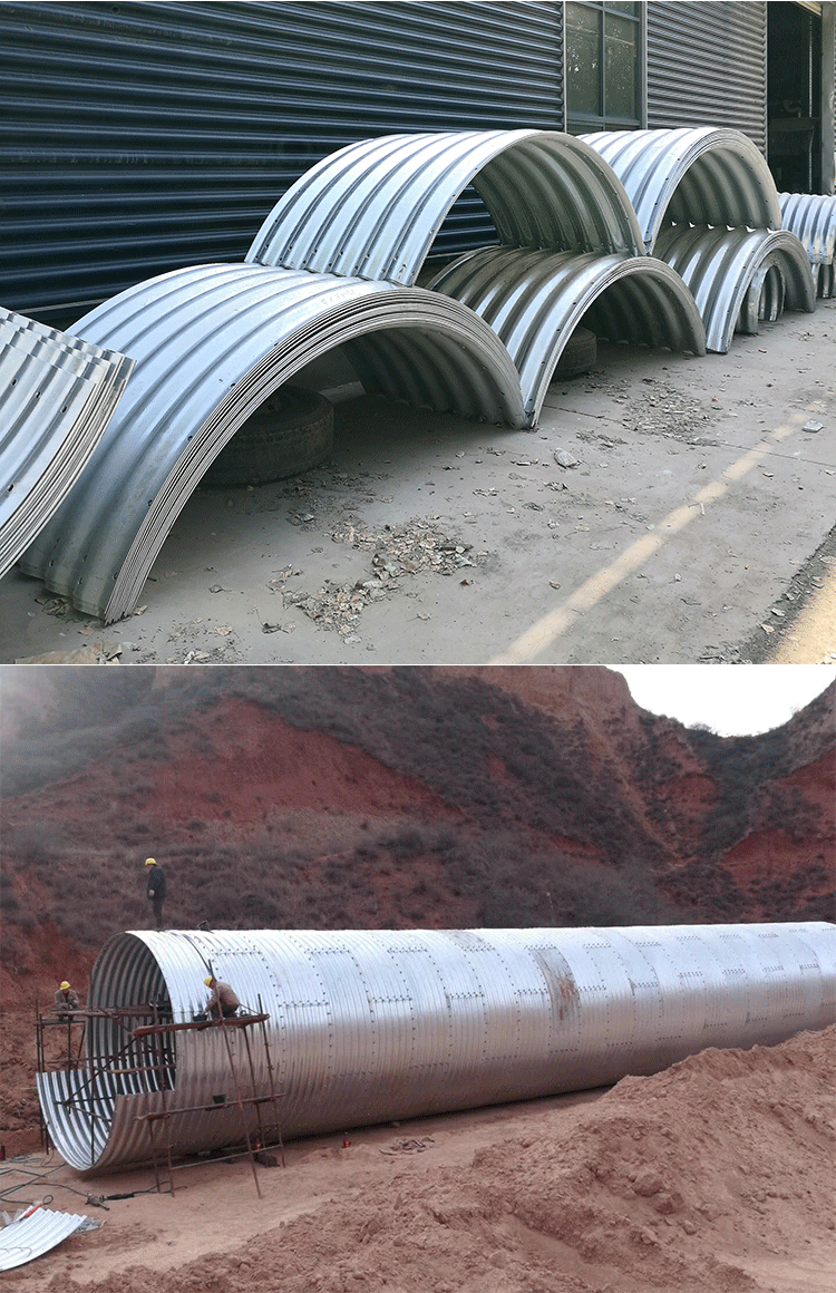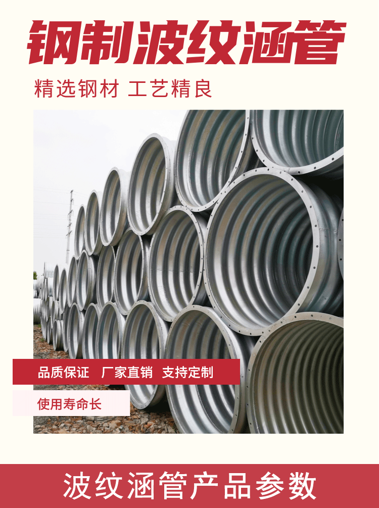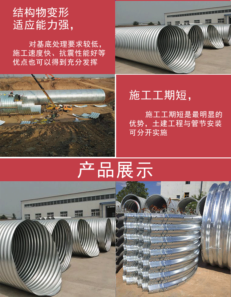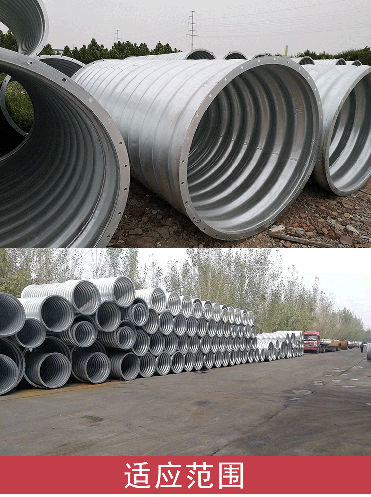 ③使用寿命长,钢制波纹管涵是采用钢管热浸镀锌,所以使用寿命长,寿命为80-100年,在腐蚀性特别大的环境下使用时,采用内外表面沥清附层的钢制波纹管,可在原使用寿命基础上提高约20年以上。
