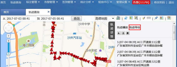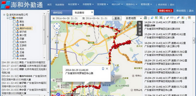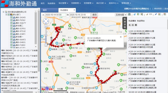 轨迹考勤查询系统 澎和外勤通是一种运用于安卓智能手机、苹果智能手机、车载GPS机、移动GPS机等设备上的专用软件,提供实时位置、活动轨迹、电子围栏、安全保障、考勤管理等服务。 图1 澎和外勤通功能框架图 澎和外勤通管理系统是兼容GPS定位技术和移动信号基站定位技术。 实现方式:手机通过安装“澎和外勤通”手机APP应用,其他硬件设备需由指定的内置了“澎和外勤通”软件的车载GPS终端机、移动式GPS终端机、智能手表等。 图2 实时位置显示界面 澎和外勤通管理系统的轨迹查询功能包涵实时轨迹查询及历史轨迹查询。 轨迹查询:自动记录并可随时查询实时轨迹及历史活动轨迹。服务器保存90天的轨迹数据,提供查询和下载。 图3 轨迹查询地图显示1 图4 轨迹查询地图显示2 快捷查询轨迹:点击地图图标,在位置信息框中点击“当天轨迹”或“三天内轨迹”查询相应的时间内轨迹信息。 图5 轨迹查询快捷链接入口 详细查询轨迹:在时间设置界面选择起始时间和结束时间,点击“查询”,查看终端设备该时间段内的活动轨迹情况。 图6 轨迹查询详细数据 “轨迹详情”:轨迹信息的详细描述列表,轨迹序号、日期时间、速度及详细地址信息,点击位置信息条目,地图上将显示红色的位置点位置框,可以查看该地点的具体信息。 图7 位置点详细信息 轨迹回放:动画模拟轨迹行驶行为。 图8 动画演示轨迹 轨迹数据导出:“轨迹详情”详细数据可以下载保存Excel表格数据。 图9 轨迹导出 澎和外勤通是一种运用于安卓智能手机、苹果智能手机、车载GPS机、移动GPS机等设备上的专用软件,提供实时位置、活动轨迹、电子围栏、安全保障、考勤管理等服务。 主要功能介绍 实时位置:随时查询手机、车辆、及各种终端机的实时位置、速度以及实时的状态信息。 轨迹查询:自动记录手机、车辆、及各种终端机不少于90天的轨迹信息,并可随时查询。 电子围栏:可以设定各种形状的电子围栏,可以设置手机、车辆等终端机多种围栏告警形式。 区域告警:对关联的手机、车辆等终端机进行多种形式区域设置,并使用告警提示。 远程考勤:记录手机、车辆等终端机开启和关闭数据,了解终端机的工作状态。 位置明细:记录手机或车辆等终端机在具体时间的位置、地址、停留情况等信息数据。 实时考勤:实时记录人员或车辆等终端机实时考勤状况,了解实时工作状态。 远程签到:可根据实际需要进行手机的远程签到打卡,随时上报位置及照片信息。 日报上传:可将每日的工作计划和总结上传,便于管理人员随时了解工作情况。 考勤统计:自动生成多种形式的考勤统计报表,可根据考勤统计数据汇总,管理到位。 签到明细:自动生成签到明细报表、对各种终端机对指定点实时和历史签到数据。 标注签到:自动生成标注点签到报表、对手机或车辆等终端机在关注位置点的签到数量。 手机标注:可随时直接用手机在现场标注地点,实时直接在平台地图上显示。 地图标注:直接在地图上标注出您您关注的客户、供应商渠道、重点区域等,定制专用地图。 多个行业2万多个企业的几十万名人员和车辆使用过澎和外勤通平台,同时在线服务人员和车辆数量达36万多,您的信任是我们完善平台、提升服务的动力……