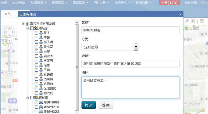 专用电子业务地图系统 澎和外勤通是一种运用于安卓智能手机、苹果智能手机、车载GPS机、移动GPS机等设备上的专用软件,提供实时位置、活动轨迹、电子围栏、安全保障、考勤管理等服务。 图1 澎和外勤通功能框架图 澎和外勤通管理系统是兼容GPS定位技术和移动信号基站定位技术。 实现方式:手机通过安装“澎和外勤通”手机APP应用,其他硬件设备需由指定的内置了“澎和外勤通”软件的车载GPS终端机、移动式GPS终端机、智能手表等。 图2 实时位置显示界面 澎和外勤通手机APP客户端除了在后台自动上传数据,使用者还可以根据需要随时采用手动签到功能,将实时位置、实时实景照片上传系统,供管理员实时查询。 专用电子业务地图系统,直接在地图上标注出您关注的客户、供应商渠道、重点位置等,定制专用业务地图。 澎和外勤通的地图标注,不仅可以采用在系统平台地图上标注地点的方式,还可以通过手机APP在实际位置进行实时标注,提高标注的准确性。 平台地图标注,查找到相应位置进行地图标注。 图3 地图标注设置 使用手机上的“澎和外勤通”APP进行实地标注。还可以将实景相片上传至系统。 图4 手机标注操作 管理员可以对标注点进行地图显示、查询、修改等操作,使标注实时与业务专用紧密关联。形成专用的业务地图。 图5 标注点显示 标注点设置后,可以将人员和车辆与标注点关联,系统可以自动统计此标注点签到统计表。使管理员了解此标注点的关联度。 图6 标注点签到统计表 澎和外勤通是一种运用于安卓智能手机、苹果智能手机、车载GPS机、移动GPS机等设备上的专用软件,提供实时位置、活动轨迹、电子围栏、安全保障、考勤管理等服务。 主要功能介绍 实时位置:随时查询手机、车辆、及各种终端机的实时位置、速度以及实时的状态信息。 轨迹查询:自动记录手机、车辆、及各种终端机不少于90天的轨迹信息,并可随时查询。 电子围栏:可以设定各种形状的电子围栏,可以设置手机、车辆等终端机多种围栏告警形式。 区域告警:对关联的手机、车辆等终端机进行多种形式区域设置,并使用告警提示。 远程考勤:记录手机、车辆等终端机开启和关闭数据,了解终端机的工作状态。 位置明细:记录手机或车辆等终端机在具体时间的位置、地址、停留情况等信息数据。 实时考勤:实时记录人员或车辆等终端机实时考勤状况,了解实时工作状态。 远程签到:可根据实际需要进行手机的远程签到打卡,随时上报位置及照片信息。 日报上传:可将每日的工作计划和总结上传,便于管理人员随时了解工作情况。 考勤统计:自动生成多种形式的考勤统计报表,可根据考勤统计数据汇总,管理到位。 签到明细:自动生成签到明细报表、对各种终端机对指定点实时和历史签到数据。 标注签到:自动生成标注点签到报表、对手机或车辆等终端机在关注位置点的签到数量。 手机标注:可随时直接用手机在现场标注地点,实时直接在平台地图上显示。 地图标注:直接在地图上标注出您您关注的客户、供应商渠道、重点区域等,定制专用地图。 多个行业2万多个企业的几十万名人员和车辆使用过澎和外勤通平台,同时在线服务人员和车辆数量达36万多,您的信任是我们完善平台、提升服务的动力……